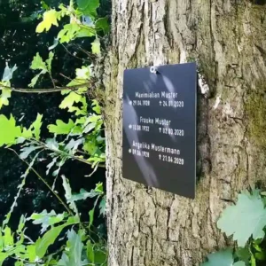 Mit einer Namenstafel wird eine Grabstelle zu einem persönlichen Ort des Erinnerns und Gedenkens. Im Ruhewald Agathenburg entscheiden jedoch Sie, ob eine Namenstafel an der Grabstelle angebracht werden soll oder nicht. Alle Namenstafeln im Ruhewald Agathenburg sind einheitlich gestaltet und aus schwarz eloxiertem Metall hergestellt. Dort können auf Wunsch Vor- und Nachname sowie Geburts- und Sterbedatum der Verstorbenen genannt werden.